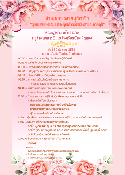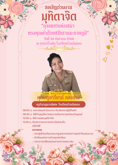 ขอเชิญชวนร่วมงานมุฑิตาจิต คุณครูอารียาภ์ กองช่าง ครูชำนาญการพิเศษ โรงเรียนบ้านเนินทอง